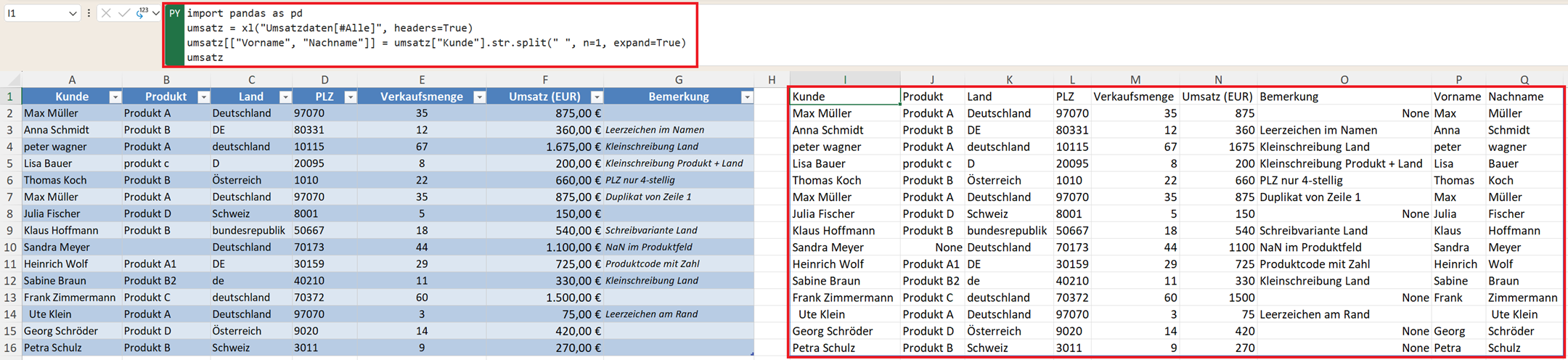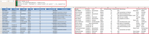 Die Daten werden automatisch auf zwei neue Spalten verteilt. Der Parameter n=1 sorgt dafür, dass nur beim ersten Leerzeichen getrennt wird – das macht die Funktion robuster bei Doppelnamen oder mehreren Vornamen.