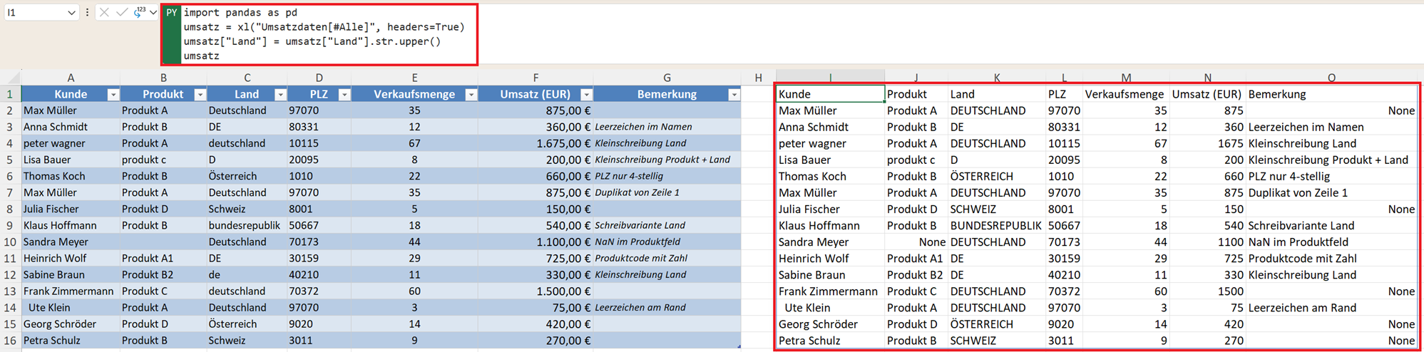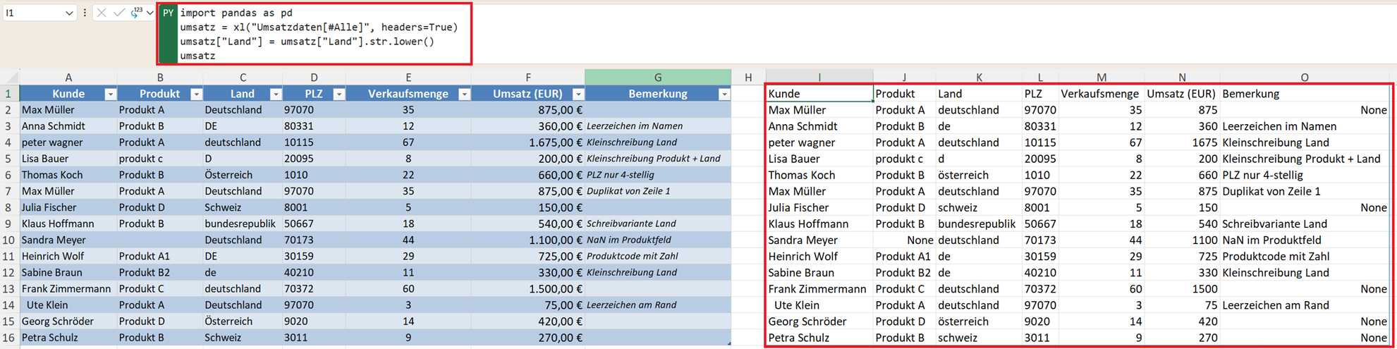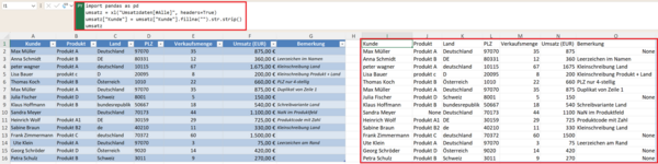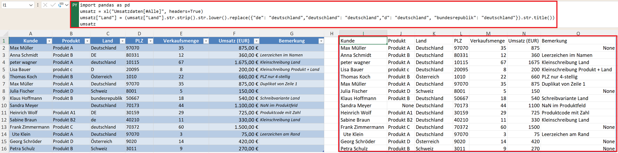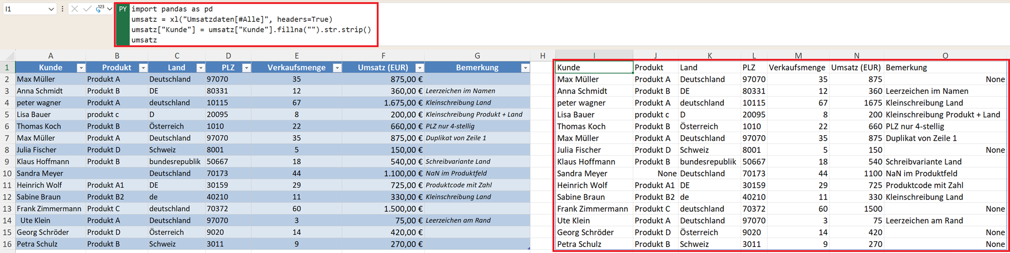 Tipp: Wenn Ihre Spalte NaN (leere Zellen) enthält, brechen str.strip(), str.replace() oder str.lower() manchmal ab. Sicherer ist es, vor der Bereinigung fillna("") zu verwenden: