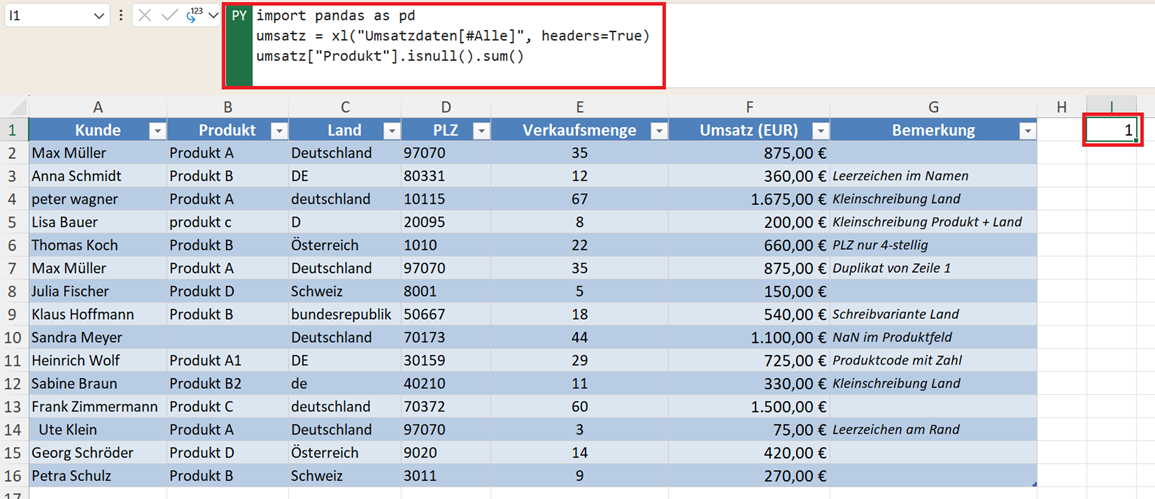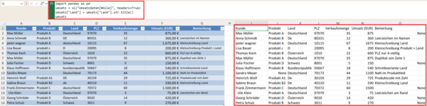 umsatz["Land"] = (umsatz["Land"].str.strip().str.lower().replace({"de": "deutschland","deutschland": "deutschland","d": "deutschland", "bundesrepublik": "deutschland" }).str.title())