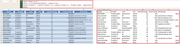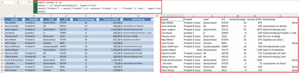 umsatz["Produkt"] = umsatz["Produkt"].str.replace("Produkt A", "Produkt Alpha", regex=False)
