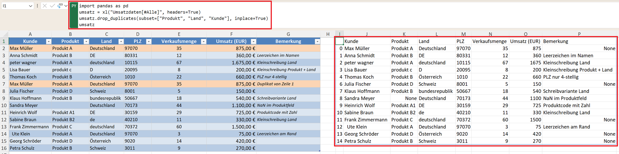 umsatz.drop_duplicates(subset=["Produkt", "Land", "Kunde"], inplace=True)