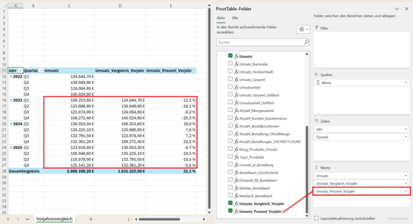 Die folgende Pivot-Tabelle zeigt dies für einen Quartalsvergleich.