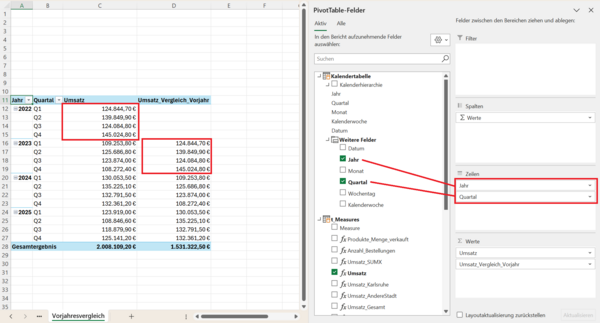 Dazu wählen Sie nur die gewünschte Periode (zum Beispiel Quartal, Monat, Kalenderwoche) aus der Kalendertabelle aus. In der Pivot-Tabelle werden immer die korrekten Umsätze aus dem aktuellen und dem Vorjahr nebeneinandergestellt.