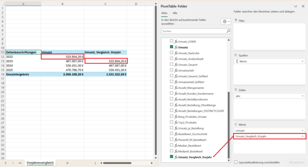 Der eigentliche Mehrwert entsteht, wenn Sie die Abweichungen zum Vorjahr nicht nur absolut, sondern auch prozentual darstellen. Dazu kombinieren Sie die beiden Measures Umsatz und Umsatz_Vergleich_Vorjahr.