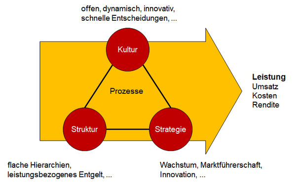 Abbildung 3 zeigt, wie diese Funktionen einer Organisationskultur auch die Leistung der Organisation oder des Unternehmens mit beeinflussen. Sie ist, wie Struktur und Strategie, ein wichtiger Erfolgsfaktor für den Erfolg des Unternehmens. Sie kann den Erfolg maßgeblich mit herbeiführen – sie kann aber auch Grund dafür sein, dass ein Unternehmen in seiner Umwelt scheitert.
