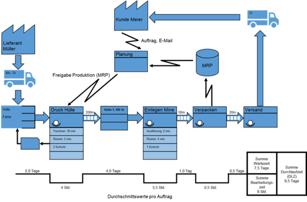 Material, Teile, Zwischenprodukte, Endprodukte und Logistik im Wertstrom-Diagramm