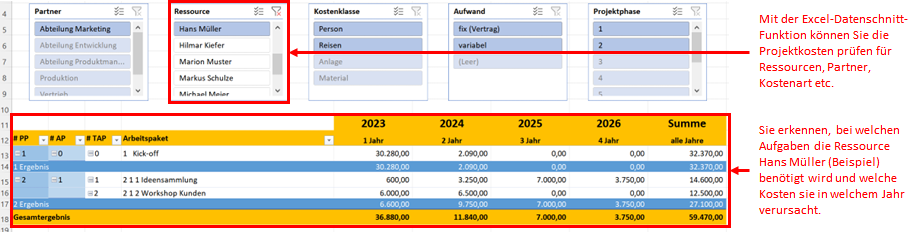 Mithilfe der Datenschnitt-Funktion von Excel können Sie dann beispielsweise die Kosten ermitteln, die ein bestimmter Projektmitarbeiter verursacht. Das zeigt die folgende Abbildung an einem Beispiel.