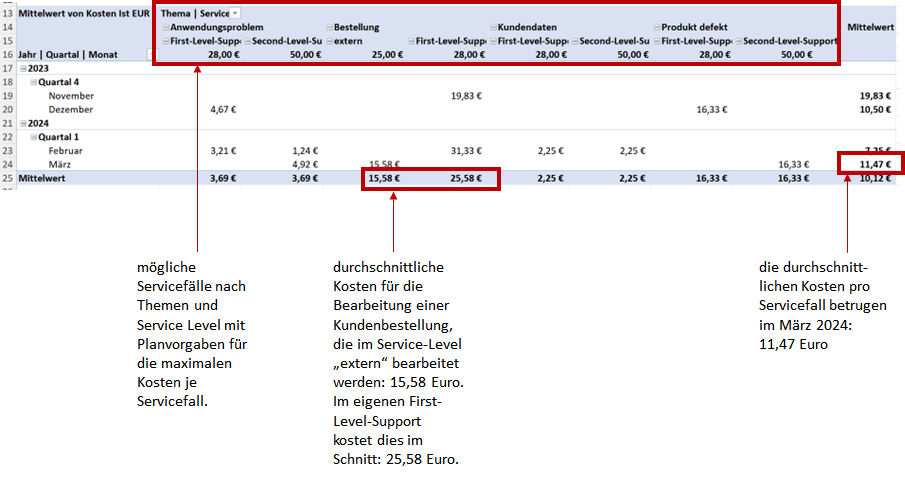 In der Tabelle sind auch die Planvorgaben in der jeweiligen Spaltenüberschrift aufgeführt. Beispiel: Die Bearbeitung eines Anwendungsproblems (Thema) im First-Level-Support (Service-Level) darf maximal 28,00 Euro kosten.