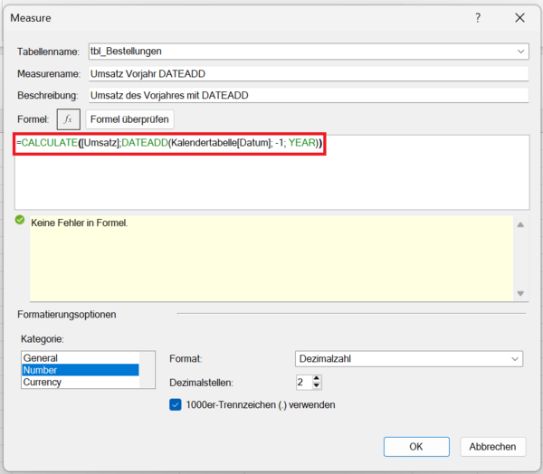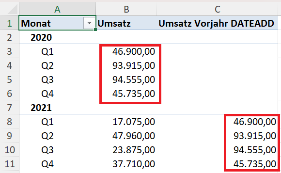 Das bedeutet: DATEADD verschiebt den Filterkontext Ihrer Kalendertabelle um eine festgelegte Anzahl an Intervallen – und berechnet dann auf dieser Grundlage Ihr Measure neu.