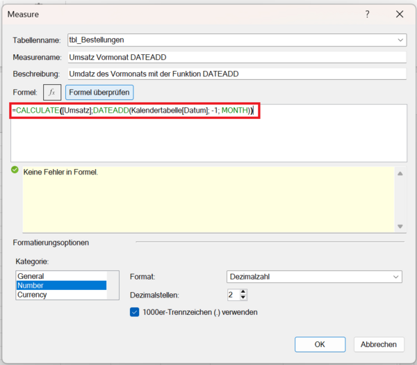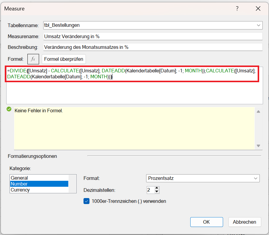 Umsatz Veränderung % :=DIVIDE([Umsatz] - CALCULATE([Umsatz]; DATEADD(Kalender[Datum]; -1; MONTH)); CALCULATE([Umsatz]; DATEADD(Kalender[Datum]; -1; MONTH)))