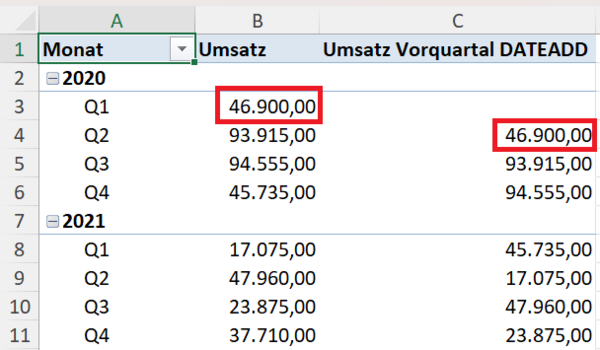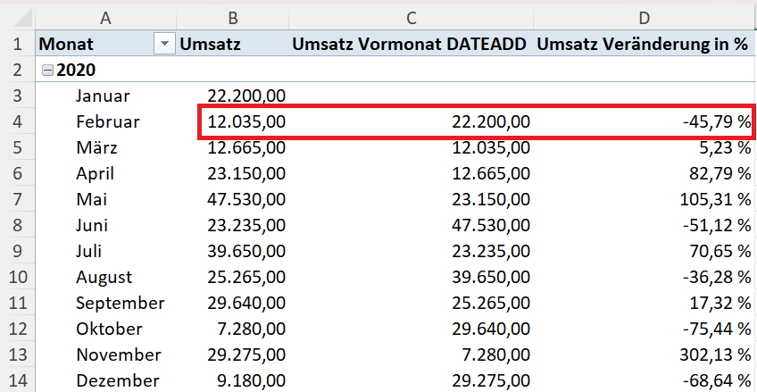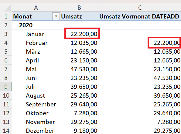 - Das Ergebnis ist der Umsatz des Vormonats – automatisch angepasst an den Zeitraum, den Sie in Ihrer Pivot-Tabelle betrachten.