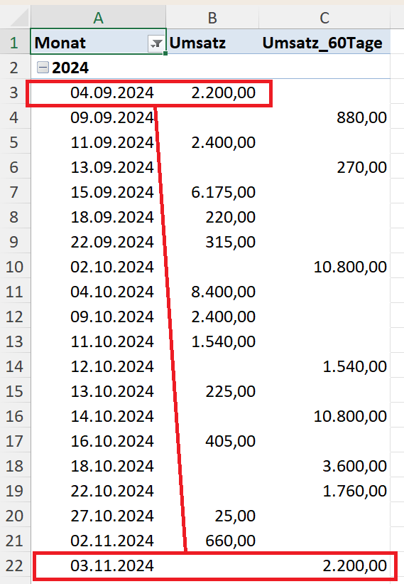 =CALCULATE([Umsatz]; DATEADD(Kalendertabelle[Datum]; -60; DAY))