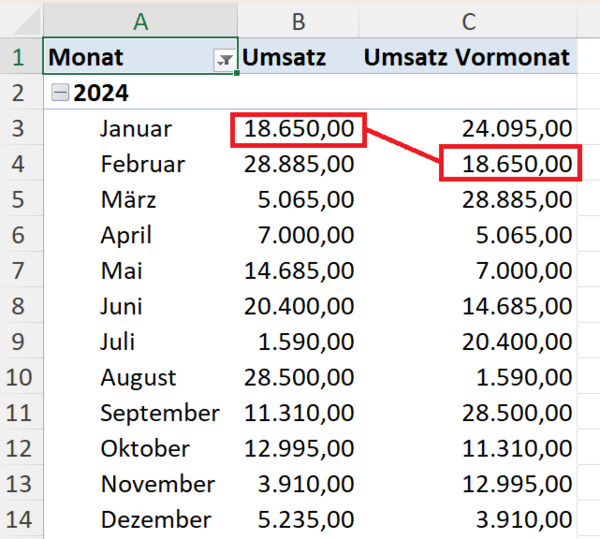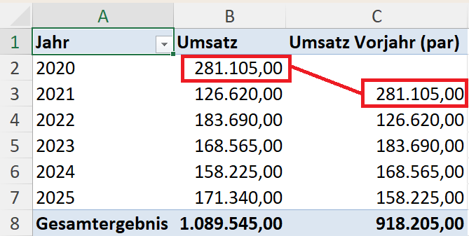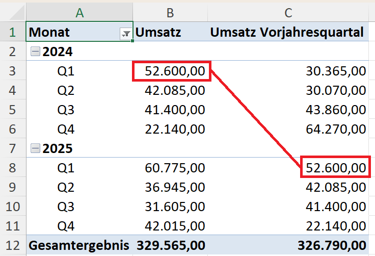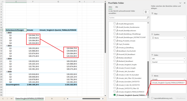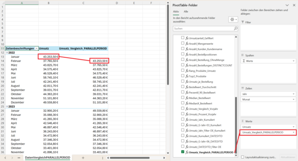 Solche Fragen tauchen im Arbeitsalltag ständig auf. Mit PARALLELPERIOD können Sie diese Analysen direkt in Ihren Pivot-Tabellen abbilden – ohne komplizierte Workarounds oder zusätzliche Hilfsspalten.