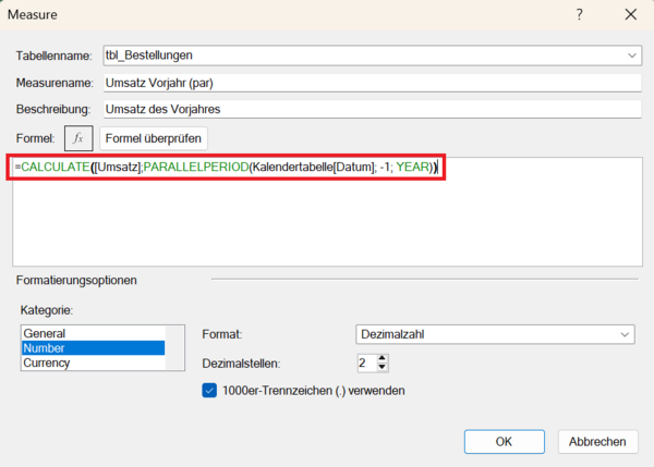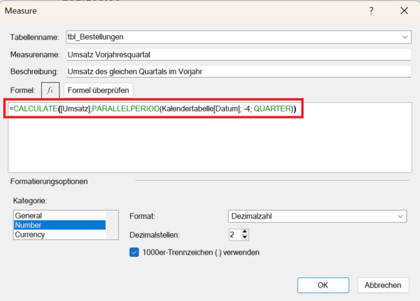 Umsatz Vorjahresquartal := CALCULATE([Umsatz]; PARALLELPERIOD(Kalender[Datum]; -4; QUARTER))