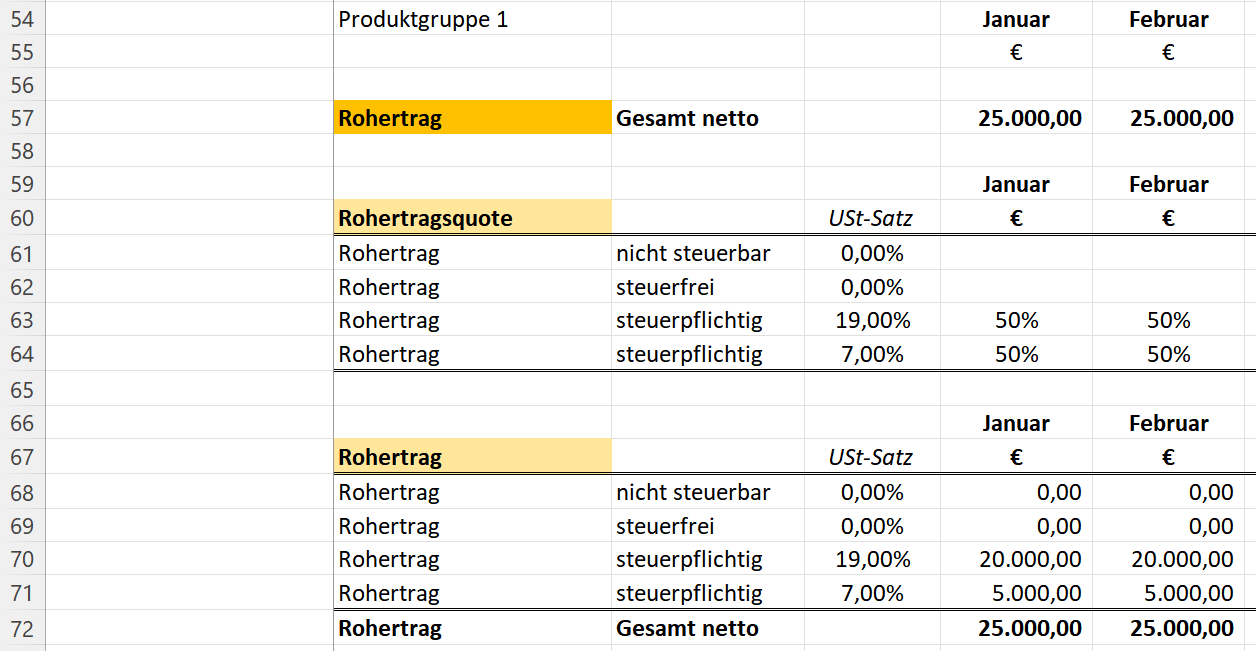 Das Excel-Tool berechnet aus den Umsatzerlösen und dem Materialeinsatz den Rohertrag – für die jeweilige Umsatzkategorie (Umsatzsteuerart) und für den einzelnen Monat. Der Rohertrag wird in absoluten Geldwerten und prozentual als Rohertragsquote angegeben (siehe folgende Abbildung).
