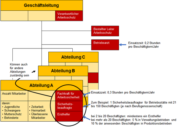 Halten Sie in Ihrem Organigramm fest, welche Stellen und Personen mit Aufgaben zum Arbeitsschutz betraut sind. Dokumentieren Sie außerdem die Zahl der Jugendlichen, Behinderten, Schwangeren, stillende Mütter und Zeitarbeiter. Abbildung 1 zeigt ein Beispiel, wie ein Organigramm aus Sicht des Arbeitsschutzes visualisiert sein kann.