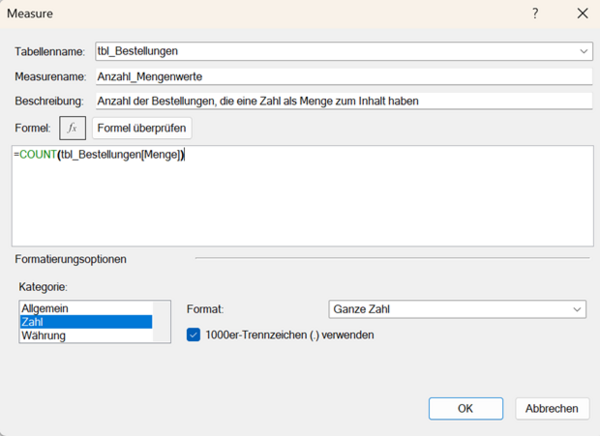 | Fehlende_Mengenwerte | COUNTBLANK( tbl_Bestellungen[Menge]) | Fehlende Mengenangaben |