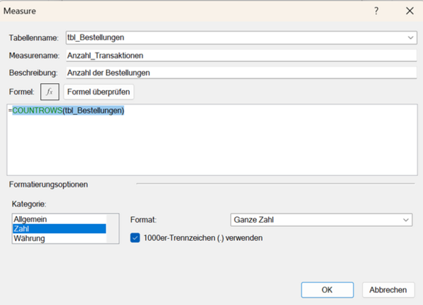 | Anzahl_Transaktionen | COUNTROWS(tbl_Bestellungen) | Alle Datensätze in der Bestelltabelle |