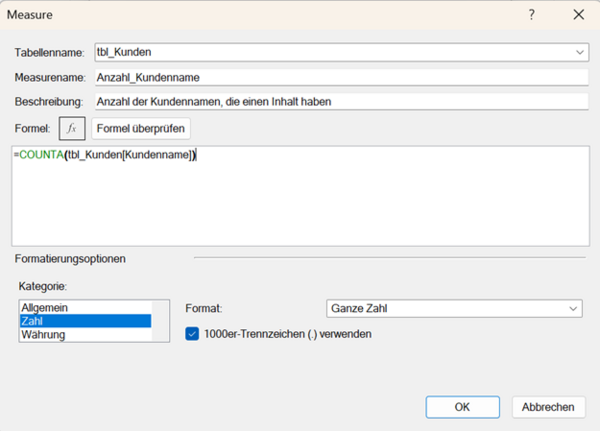 | Anzahl_Kunden | DISTINCTCOUNT( tbl_Bestellungen[KundenID]) | Unterschiedliche Kunden |