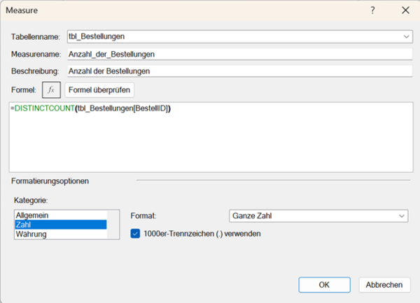 | Anzahl_Bestellungen | DISTINCTCOUNT( tbl_Bestellungen[BestellID]) | Eindeutige Bestellnummern |