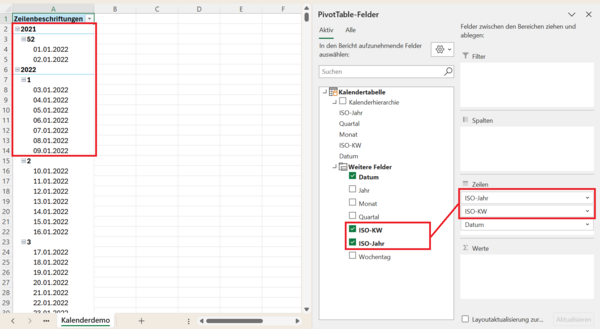 Mit dieser Kalendertabelle werden dann alle Kalenderwochen in Ihren Pivot-Tabellen an der korrekten Stelle einsortiert.