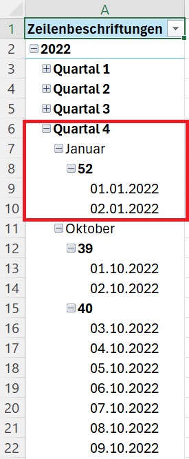 Der 01.01.2022 fällt in die Kalenderwoche 52 des Vorjahres (2021). Die Pivot-Tabelle ordnet das Datum korrekt der KW 52 zu und ordnet diese auch korrekt dem 4. Quartal zu – aber dem falschen Jahr. Deshalb erscheint der 01.01.2022 an einer falschen Stelle.