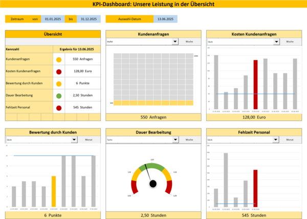 Mit dem hier beschriebenen Excel-Tool können Sie bis zu fünf Key Performance Indicators (KPI) als Dashboard auf einer Übersichtsseite visualisieren. Dazu finden Sie für jede Kennzahl drei Varianten zur Visualisierung: