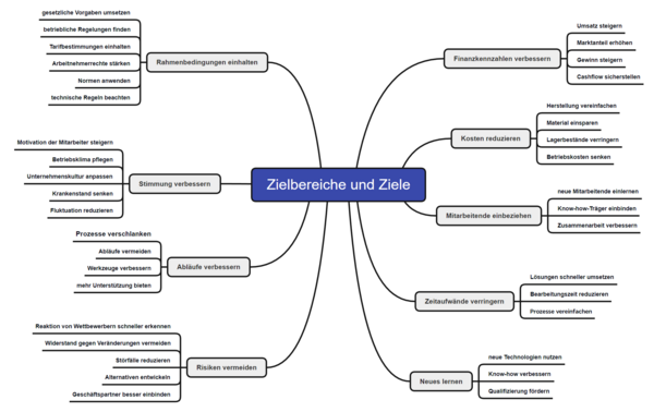 Zum Beispiel: Kosten reduzieren, Mitarbeiterzufriedenheit verbessern, Kundenbindung erhöhen, Fehler vermeiden … Die folgende Abbildung gibt eine Übersicht über mögliche Zielbereiche und Ziele, um die es gehen kann.