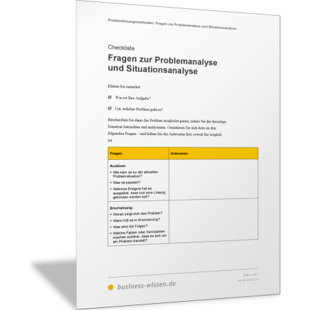 Analysieren Sie mit dieser Checkliste zunächst Ihr Problem und die Situation, bevor Sie mit dem Problemlösen beginnen. Überlegen Sie genau, welche Fragen Sie bereits beantworten können und wie die Antworten (bislang) lauten. Klären Sie mithilfe der Checkliste, was Sie vor der Lösungsfindung noch recherchieren oder ermitteln müssen?