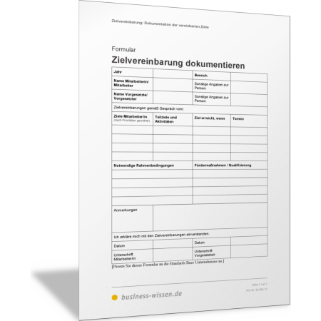 Mit dieser Formular-Vorlage halten Sie die Zielvereinbarungen mit Ihren Mitarbeiterinnen und Mitarbeitern schriftlich fest. Damit sorgen Sie für eine standardisierte und nachvollziehbare Dokumentation. Sie ist die Grundlage für die spätere Überprüfung der Zielerreichung und für die Leistungsbeurteilung.