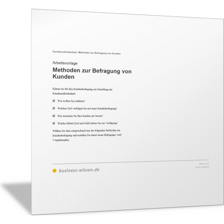In dieser Vorlage sind unterschiedliche Methoden und Instrumente für eine Kundenbefragung benannt. Außerdem sind die jeweiligen Vorteile und Nachteile der Methode dargestellt. So können Sie prüfen, welche Form der Kundenbefragung für Ihre Zwecke und für die gegebenen Rahmenbedingungen geeignet ist.