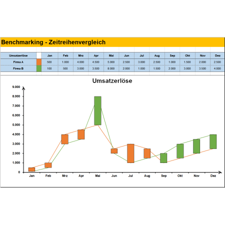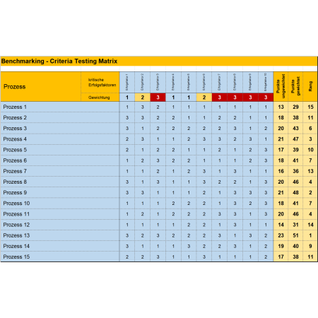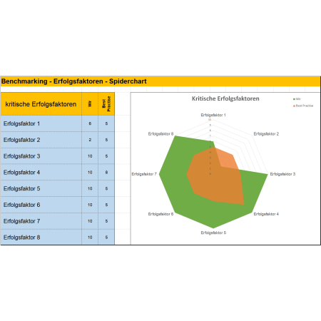 Für den Leistungsvergleich finden Sie zahlreiche Excel-Vorlagen. Hier stellen Sie Kennzahlen zusammen, die Ihre jeweiligen Leistungen und Prozesse quantitativ beschreiben. Sie ergänzen diese um die Leistungen des Benchmarking-Partners und können so Abweichungen vergleichen und Verbesserungspotenziale identifizieren. Als Excel-Vorlage finden Sie unter anderem: Kennzahlen für das Benchmarking vergleichen, Kritische Erfolgsfaktoren für das Benchmarking vergleichen und visualisieren, Leistungsvergleich mit Benchmarking-Partner im Zeitverlauf.