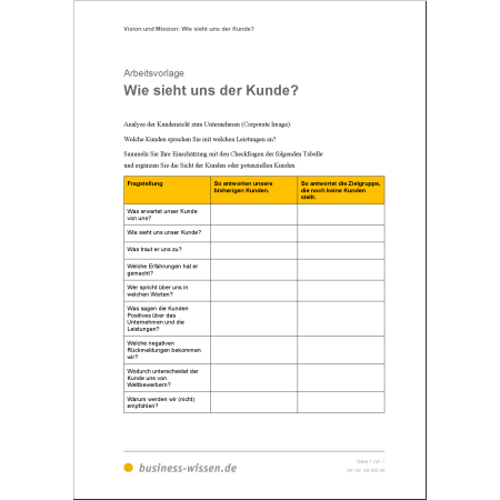Ermitteln Sie zunächst, wie Ihre Kunden Ihr Unternehmen sehen, etwa durch direkte Gespräche. Dazu nutzen Sie die Vorlage Analyse der Kundensicht zum Unternehmen. Danach formulieren Sie eine erste Mission und testen diese bei Ihren Zielgruppen.