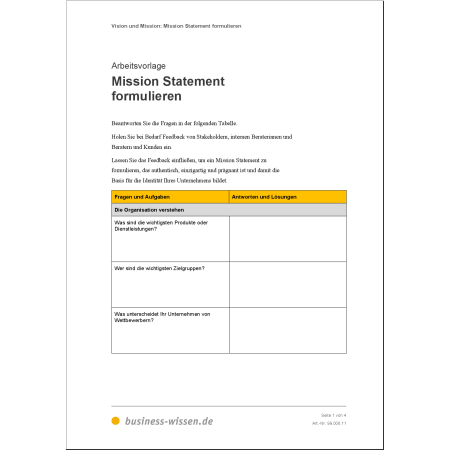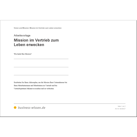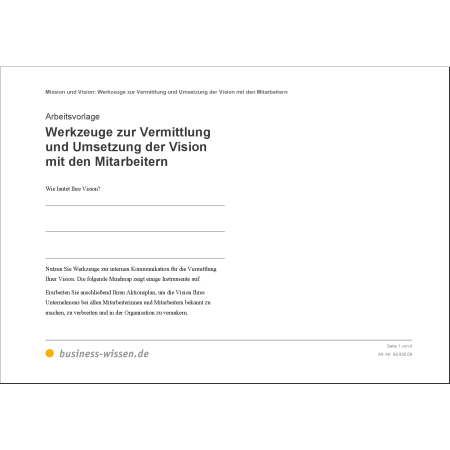 Letztlich müssen Sie Ihre Vision und Mission nach außen tragen und kommunizieren. Hierzu stellen wir Ihnen die Vorlagen Werkzeuge zur Vermittlung und Umsetzung der Vision mit den Mitarbeitern sowie Mission in der Werbung sichtbar machen zur Verfügung.