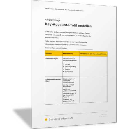 Halten Sie in dieser Vorlage fest, was Ihre wichtigen Kunden auszeichnet, welche Merkmale sie haben und welche Potenziale als Key-Account-Kunde Sie in ihnen erkennen. Beschreiben und erläutern Sie für diese ausgewählten Kunden, welche besonderen Anforderungen sie an Ihr Unternehmen stellen, wer beim Kunden im Buying-Center mitwirkt und welche Einstellung diese Personen haben. Halten Sie schließlich fest, womit Sie die Tür zum Kunden öffnen könnten. Das ist Ihr Einstieg in das Key-Account-Management.