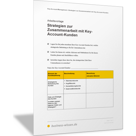 Mit dieser Vorlage entwickeln Sie eine geeignete Strategie für die Zusammenarbeit mit Ihren unterschiedlichen Key-Account-Kunden. Sie prüfen dessen Potenziale, klären Ihre Ziele und leiten daraus eine Strategie ab. Außerdem finden Sie in der Vorlage mögliche Maßnahmen, um diese Strategie dann umzusetzen.