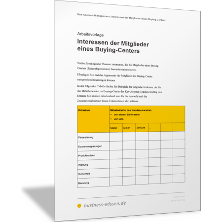 Mit dieser Vorlage stellen Sie mögliche Themen zusammen, die die Mitglieder eines Buying-Centers (Einkaufsgremiums) Ihres Kunden besonders interessieren. Sie können überlegen, welche Argumente diese entsprechend überzeugen können. Halten Sie in der Vorlage fest, was einzelne Personen, Mitarbeitende Ihres Kunden, von Ihrem Unternehmen erwarten.