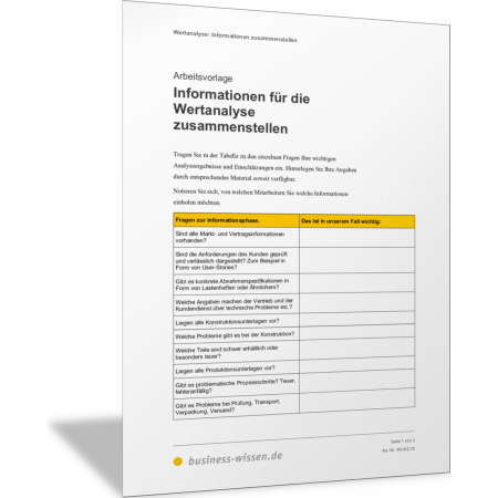 In dieser Vorlage finden Sie zahlreiche Aspekte und Fragestellungen, zu denen Sie für eine Wertanalyse Informationen zusammenstellen müssen. Diese Informationen sind Grundlage für jede Wertanalyse. Sie brauchen Informationen zu Kunden, Marktentwicklung, Wettbewerb, Technik, Recht, Einkauf, Logistik, Herstellung und weiteren Themen. In dieser Vorlage halten Sie für Ihr Wertanalyse-Projekt fest, welche Informationen für Sie wichtig sind und woher Sie diese bekommen.