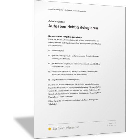 Wer es bislang nicht gewohnt war, Aufgaben zu delegieren, wird sich wahrscheinlich damit zunächst schwertun. Zum einen muss die Barriere des „Loslassens“ überwunden werden; zum anderen muss erkannt werden, worauf es beim Prozess der Aufgabendelegation ankommt. Denn wer schlecht delegiert, bekommt schlechte Ergebnisse und sieht sich dann meist in seinen Vorurteilen bestätigt, dass das Delegieren von Aufgaben am Ende nur mehr Arbeit mache. Die Vorlage unterstützt Sie dabei, eine neue Perspektive zum Delegieren einzunehmen.