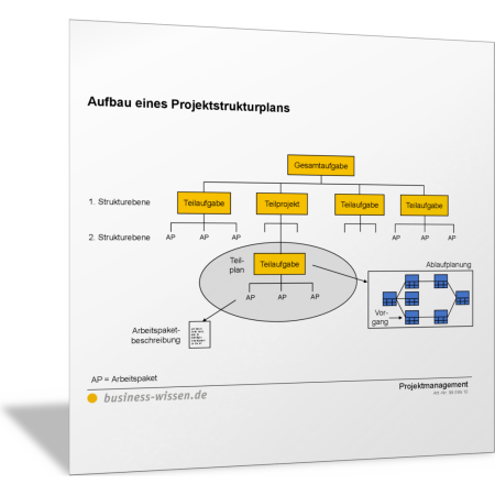 In dieser Darstellung erkennen Sie, wie ein Projektstrukturplan aufgebaut ist. Gliederungsmerkmale sind Teilprojekte, Teilaufgaben und Arbeitspakete. Die zeitliche Reihenfolge wird in einem Netzplan dargestellt. Dementsprechend bauen Sie den Projektstrukturplan auf.