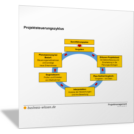 Die Abbildung zeigt die einzelnen Schritte und Aufgaben, die im Rahmen der Projektüberwachung und der Projektsteuerung durchzuführen sind. Die Abfolge der einzelnen Schritte ist der sogenannte Projektsteuerungszyklus. Sie können in dieser Übersicht und Vorlage markieren und erläutern, was Sie für Ihre Projekte und bei den einzelnen Schritten genau durchführen.