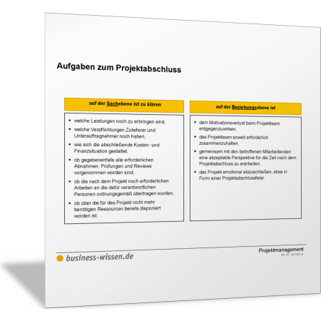 Führen Sie die Aufgaben durch, die zum Projektabschluss (Close-down des Projekts) gehören. In dieser Liste wird unterschieden zwischen Aufgaben, die die Sachebene betreffen, und denen, die für die Beziehungsebene wichtig sind. Nutzen Sie diese Vorlage, um für Ihr Projekt eine To-do-Liste zum Projektabschluss zu erstellen.