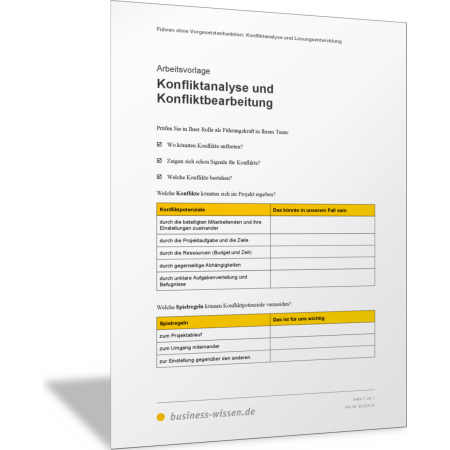 Wenn Sie im Team mit anderen arbeiten, müssen Sie Konflikte rechtzeitig erkennen und nach Lösungen suchen. In dieser Vorlage können Sie Konfliktpotenziale festhalten, Spielregeln definieren und Konflikte analysieren, wenn sie dennoch auftreten. Außerdem halten Sie fest, wie Sie Konflikte bearbeiten und lösen können.