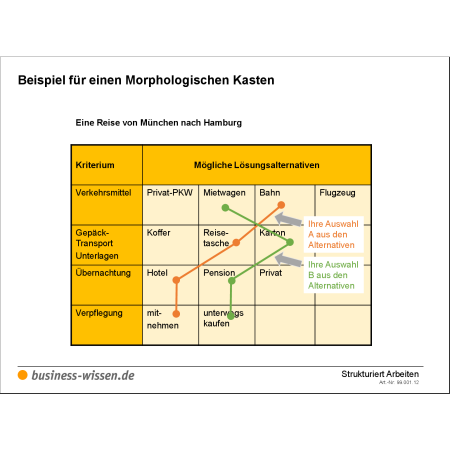 Oft ist Ihre Kreativität gefragt. Sie müssen schnell eine gute Lösung finden und diese vermitteln. Nutzen Sie dafür die Vorlagen zum Morphologischen Kasten, Mindmapping, Brainstorming, Reizwortanalyse oder Fragen mit dem Fragetrichter.