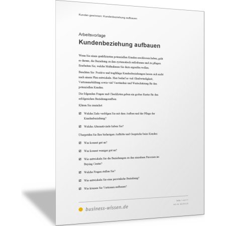 Diese Arbeitsvorlage dient als roter Faden, der Sie Schritt für Schritt hin zu einer erfolgreichen Kundenpflege führt. Gehen Sie die einzelnen Punkte in der Checkliste durch. Erstellen Sie danach einen Aktionsplan. Am Ende messen Sie, ob die Aktionen zum gewünschten Ergebnis geführt haben.