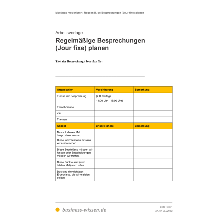 Sie finden außerdem Formulare und Vorlagen, um Einladungen zu schreiben und regelmäßige Besprechungen als Jour fixe zu planen. Damit vergessen Sie keine wichtigen Punkte. Und auch die Teilnehmenden erfahren, worum es bei der Besprechung gehen soll und wie sie sich am besten vorbereiten.
