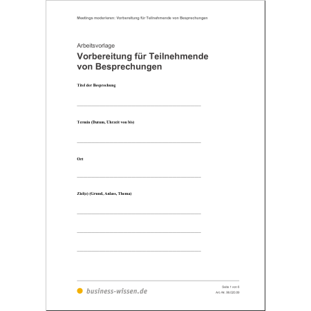 Wenn Sie nicht selbst moderieren, aber an der Besprechung teilnehmen, sollten Sie sich ebenfalls vorbereiten. Klären Sie für sich, welche Ziele Sie erreichen wollen und welche Ergebnisse Sie erwarten. Fragen Sie während der Besprechung nach, wenn Ihnen etwas unklar ist. Und bringen Sie sich aktiv in die Lösungsfindung ein, indem Sie Ihr Know-how einsetzen und Ihre Meinung sagen. Nutzen Sie die Vorlage Sich als Teilnehmer auf Meetings und Besprechungen vorbereiten und notieren Sie dort Ihre Punkte und Ihre Fragen für das nächste Meeting.