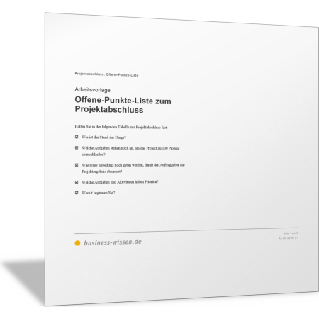 Mit dieser Liste planen und überwachen Sie die am Projektende noch offenen Punkte. Das sind Aufgaben und Maßnahmen, die bis zur Projektabnahme oder danach noch erfüllt werden müssen. Halten Sie in dieser Liste die letzten offenen Punkte Ihres Projekts fest und stellen Sie damit sicher, dass nichts vergessen wird und alle noch bis zum wirklichen Schluss dabei bleiben. Haken Sie alles Erledigte in dieser Liste ab und zeigen Sie damit, dass es dem Projektende entgegengeht.