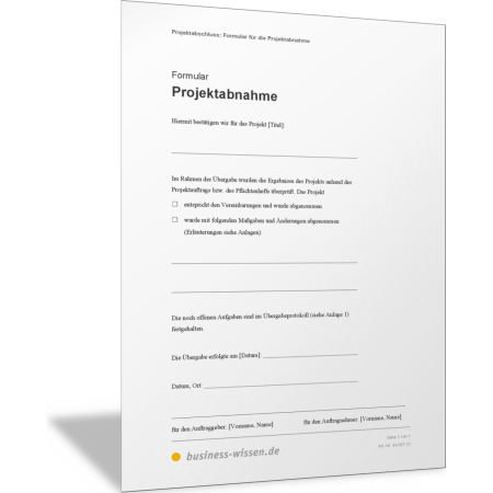 Mit diesem Formular können Sie sich vom Auftraggeber des Projekts oder vom Kunden das Projekt (Ergebnisse und Leistungen) abnehmen lassen. Der Auftraggeber bestätigt, dass damit das Projektergebnis vorliegt und übernommen wird. Gegebenenfalls wird auf noch offene Punkte verwiesen. Diese schriftliche Abnahme dient dem Gefahrenübergang, dem Eigentumsübergang und dem formalen Projektabschluss.