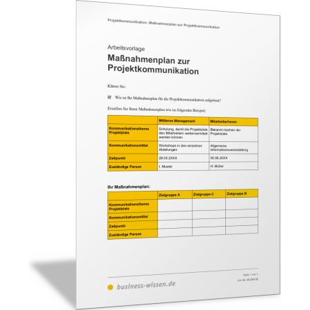 Planen Sie alle Einzelmaßnahmen zur Projektkommunikation. Sie legen Thema, Ziele, Mittel, Zeitpunkt und verantwortliche Person fest und halten diese Informationen zur Projektkommunikation in diesem Maßnahmenplan fest. Ein Beispiel zeigt, wie die Maßnahmen formuliert sein können.